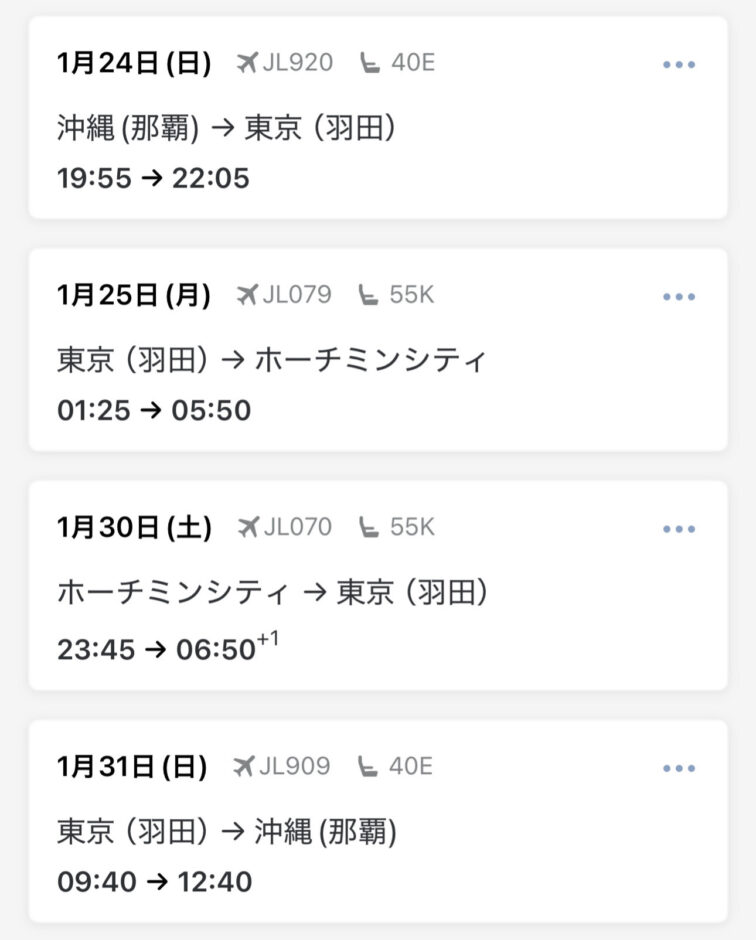 ⑤:1月30日(土):JAL便 ホーチミン23:40~羽田31日06:50(JL070便)